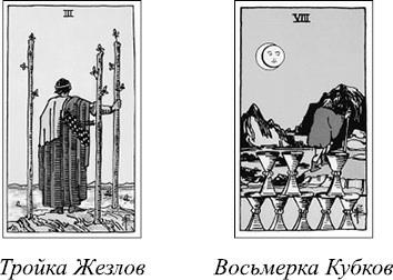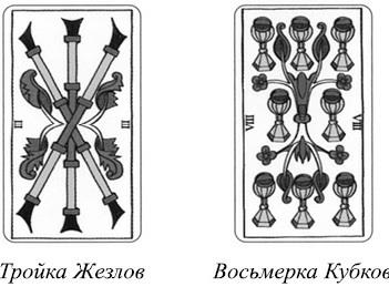 Вплоть до начала XX века Младшие Арканы иллюстрировались не более выразительно, чем современные игральные карты. Сегодня подобные изображения можно найти, например, в колоде Марсельского Таро. Если не считать обычных в таком случае узоров, рисунки на них показывают просто достоинство карты соответствующей масти и числа. На карте Тройки Жезлов можно увидеть только три Жезла, а на Восьмерке Кубков – восемь Кубков, и ничего более. Эти карты играют вспомогательную роль в системе старшинства при толковании, показывая разве что комбинацию числа с элементом, который соответствует Жезлам, Мечам, Пентаклям или Кубкам. Подробное традиционное толкование карт вы сможете найти в этой книге обо всех 56 Младших Арканах.