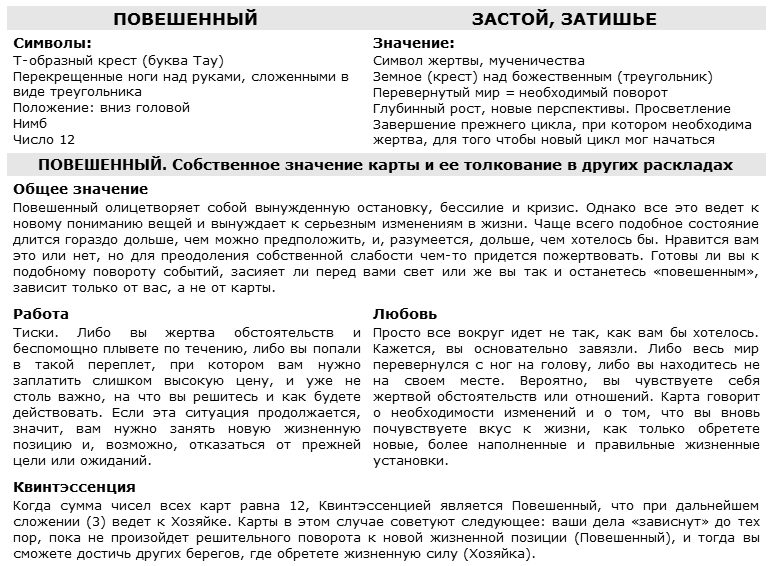 Все стоит на месте: вы зажаты в тиски или попали в капкан жизненных обстоятельств. Вы хотите и дальше идти этой дорогой? Тогда приготовьтесь к тому, что вам уготована роль жертвы. Долгое время вас не покинет ощущение, что вы можете только пассивно наблюдать за развитием событий. Но, возможно, Повешенный символизирует собой врата, открывающие путь к серьезным изменениям. Посмотрите, о чем говорит карта в позиции 4.