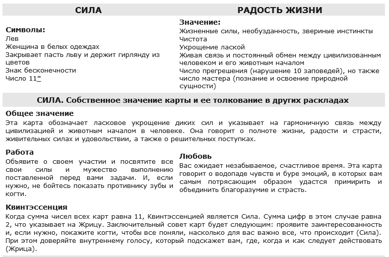 В качестве скрытой внутренней силы эта карта может иметь двоякое значение. Она либо говорит о необъяснимом фатализме, которому у вас не хватает сил противостоять, либо означает, что ваши жизненные цели и задачи до сих пор не ясны. В обоих случаях необходимо выйти на след этого внутреннего закона, хотя бы ради понимания того, что хочет от вас жизнь.