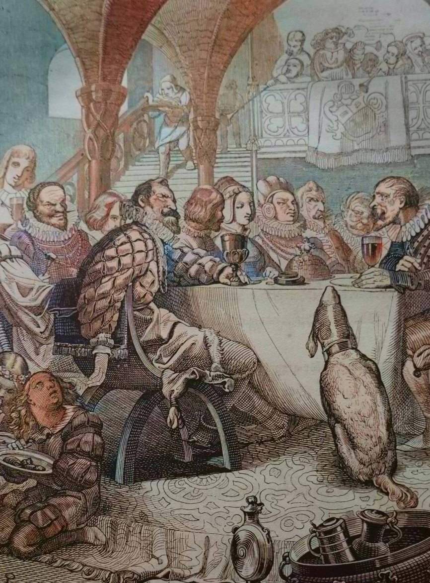 Hierauf tischte er dem Baren alle Kartoffeln in seinem Jagd Hut auf. Dieser aber verschmahte des Grafen Tafel und brummte unwillig fort: „Unglucklicher, um diesen Preis losest du dein Leben nicht, verheiss mir deine grosse Tochter Wulfild augenblicks zur Frau, wo nicht, so fress ich dich!“ In der Angst hatte der Graf dem furchteinflossenden Baren wohl alle drei Tochter verheissen und seine Gemahlin obendrein, wenn er sie verlangt hatte, denn Not kennt kein Gesetz. „Sie soll die Eure sein, Herr Bar“, sprach der Graf, der anfing, sich wieder zu erholen, doch setzte er truglich hinzu: „Unter der Bedingung, dass Ihr nach Landes Brauch die Braut loset und selber kommt, sie heimzufuhren.“ „Topp“, murmelte der Bar, „Schlag ein!“ und reichte ihm die raue Tatze hin, „In sieben Tagen los ich sie mit einem Zentner Gold und fuhre mein Liebchen heim.“ „Topp“, sprach der Graf, „Ein Wort ein Mann!“