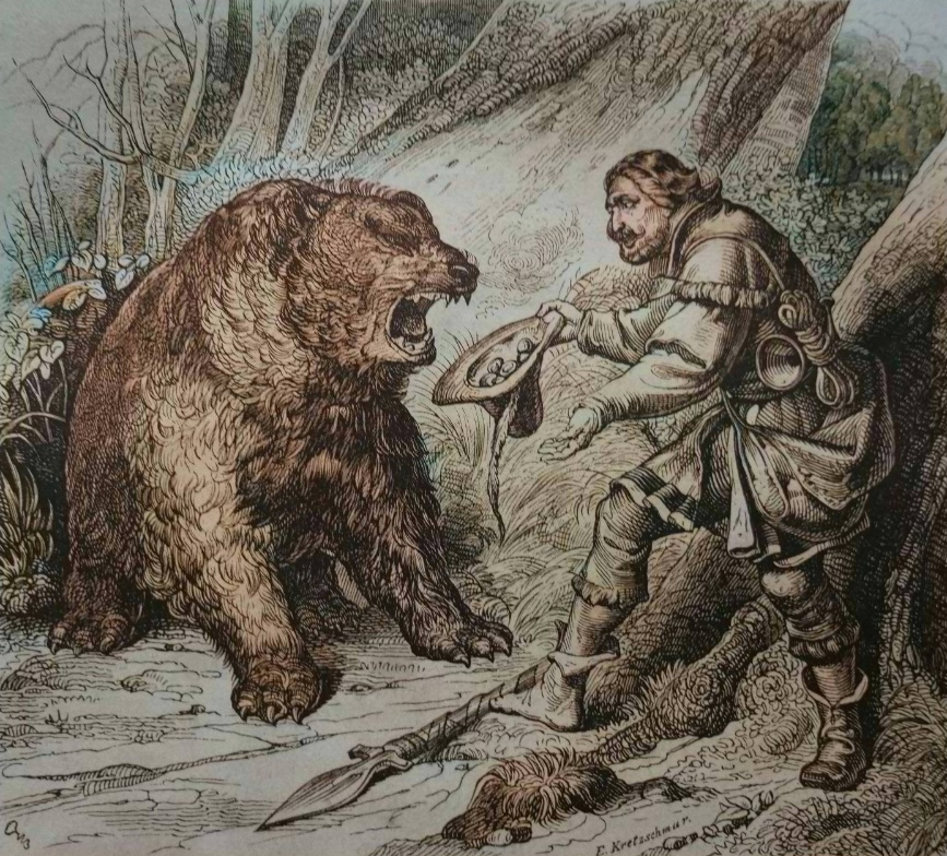 Граф ни во что не верил и не боялся никаких невидимых сил. Он шагал бодро через горы и равнины, проползал сквозь кусты и заросли так и не поймав никакую добычу. Уставший, присел он под высоким дубом, достал из охотничьей сумки несколько вареных картофелин и немного соли, чтобы здесь пообедать. Вдруг случайно поднял он свои глаза и увидел, что на него несется свирепый медведь. Бедный граф содрогнулся от этого зрелища. Убежать он не мог, а также не был экипирован для охоты на медведя. Для самообороны он взял копье в руку, чтобы защититься, насколько это возможно. Зверь подошел к нему вплотную и зарычал внятно ему следующие слова:
