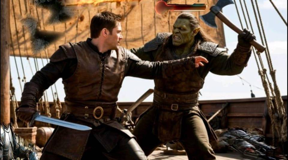 — Ааааррх! — взревел он. В руках он сжимал топор и щит. Орк кинулся к парню, у которого сильно дрожали руки. У матроса