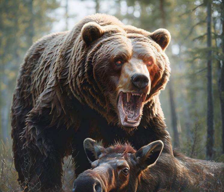 И ударили. Одуванчиками. Сразу после того, как медведь, дошел до «угощения», открыл пасть и потянулся к глотке лося над очень перспективными корнями.