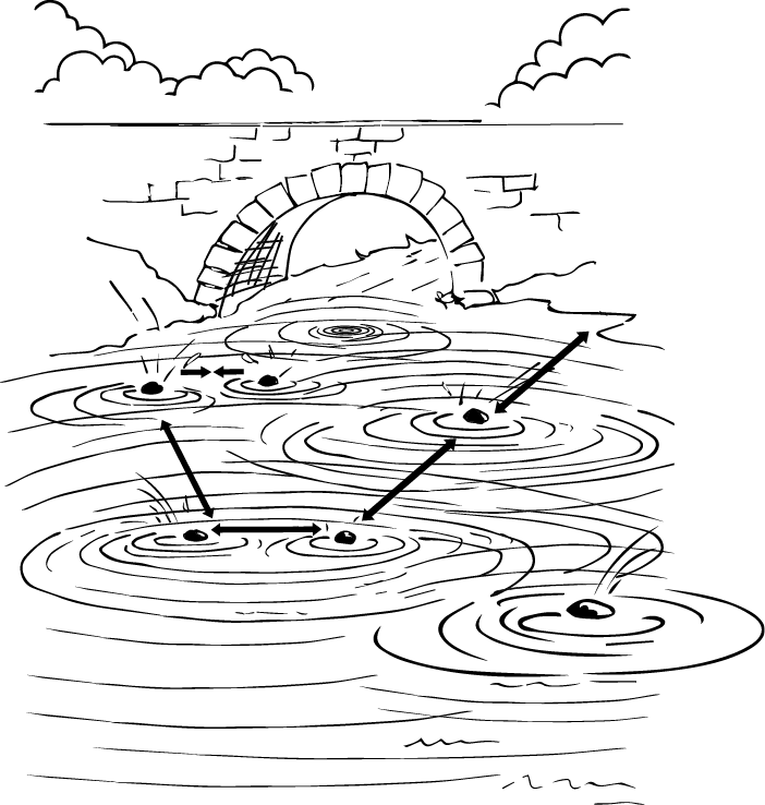 А теперь представьте, как вы или кто-то еще бросаете камень в пруд. Упавший в воду камень посылает рябь по всей поверхности пруда. Каждый из нас в своих воплощениях подобен бросаемым в пруд камням, и энергетики нашего Поля и жизни пересекаются с рябью от других камней, на которую мы – порой ведая, но обычно не ведая – воздействуем и воздействие которой испытываем.