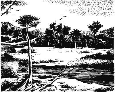 Деревья простирали кверху свои могучие ветви, переплетали их и образовывали темный свод, сквозь который не проникали лучи солнца, не проглядывала синева небес. Огромные толстые стволы растрескались, и рыжевато-черный мох, вырастая на них большими пятнами, питался их густыми соками. От корней поднимался влажный пар.