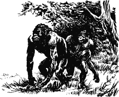 маленькими группами, тоже испугались этого небывалого дружного рева. Но, увидев, что ревут выпрямленные чунги, которые гораздо слабее их, они предостерегающе и пренебрежительно заворчали. Они даже не полезли на деревья. Так, группа, состоявшая из одного чунга, двух пом и двух подростков, подпустила к себе цепь выпрямленных чунгов совсем близко и лишь тогда, сменив любопытство на своих косматых мордах гримасой ярости и угрозы, начала громко реветь и бить себя кулаками в грудь.Некоторые из выпрямленных чунгов испугались, но большая их часть, почерпнув смелость и отвагу в собственной численности, тоже яростно и воинственно заревела. Громче всех ревели Смелый и Безволосый. Потом, словно уговорившись, они одновременно метнули в переднего огромного чунга по заостренному суку. Оба вонзились огромному чунгу прямо в грудь, он страшно заревел и упал. Остальные выпрямленные чунги тоже стали швырять камни и сучья в огромных, и одни из огромных падали и умирали, а другие побежали.