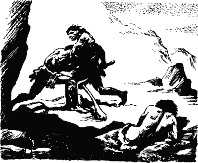 Безволосый и Косматый встали друг перед другом, взъерошившись, яростно сверкая глазами, ревели и глядели друг на друга, и каждый ожидал, что другой испугается и отступит. Но так как ни тот, ни другой не испугался, то оба кинулись друг на друга, и бой начался. Они боролись, кусались, царапались, и яростный рев их показывал, что они будут биться до победы. Но оба знали, что нужно не убивать, а только решать, кто сильнее, кого выберет Молодая пома. И потому, как бы яростно они ни сражались, никто не стремился загрызть другого. Они только кусались и царапались, сплетались руками, падали, снова вставали и снова накидывались друг на друга — искусанные, исцарапанные, окровавленные. Казалось, что силы у обоих равны, но Косматый не был таким быстрым и ловким, да и на задних лапах стоял не так прочно, и потому часто падал. Постепенно от нападения он перешел к защите, а потом и побежал, заменив яростный рев укрощенным ворчанием. Это ворчание означало, что он признает себя слабейшим и уступает Безволосому.