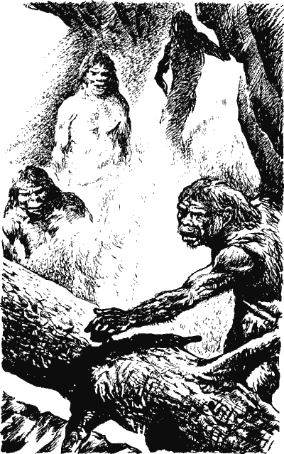 Однажды, когда группа Смелого собралась в пещере, а белое светило опускалось над лесом, снаружи послышался задыхающийся, испуганный, прерывистый визг. Безволосый и Молодая пома, сидевшие у самого входа, быстро вскочили и выглянули. Они увидели, что маленький ла-и, прижав ушки, изо всех сил мчится сквозь кусты прямо к пещере, а за ним стремительно гонится крупный рыжий и-вод.