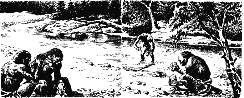 Между тем дни незаметно шли один за другим. Как с незапамятных времен, так и теперь непонятно для чунгов они превращались в месяцы, месяцы — в годы, годы — в столетия. Все это время чунги непрестанно изменялись: старые умирали, молодые старели и тоже умирали, а на их место рождались другие, измененные. У этих измененных, в свою очередь, рождались еще более измененные детеныши, а их большая группа непрестанно увеличивалась и изменялась. Когда она стала очень большой, некоторые чунги отделились от нее и исчезли в непроходимом лесу. Потом, когда им случалось встретиться, они уже не узнавали друг друга и встречались как чужие. Таким образом, от большой группы Смелого несколько раз отделялись меньшие, но все же она оставалась большой. Только она была непохожа на прежнюю, так как у всех новых рождавшихся чунгов на теле было совсем мало шерсти, а детеныши у них были еще более безволосые.