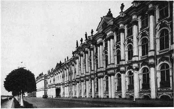 Иначе выглядит боковой фасад дворца со стороны Адмиралтейства. Он гораздо короче, чем фасад, обращенный к площади, и кажется еще меньше оттого, что Растрелли расчленил его на три части, выдвинув вперед два боковых крыла.