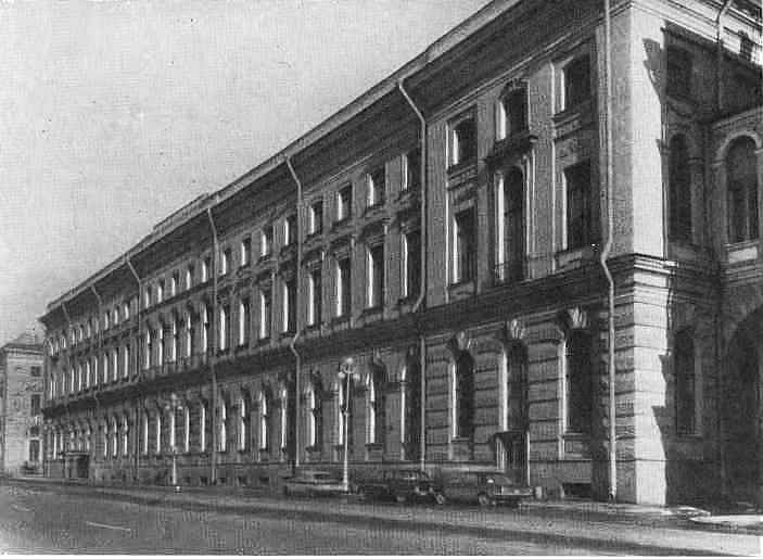 Фасады здания украшают статуи поэтов и ученых разных времен. Десять пятиметровых фигур атлантов из серого гранита, образуя портик, поддерживают на своих могучих плечах балкон. Они высечены по модели известного русского скульптора академика А. И. Теребенева.