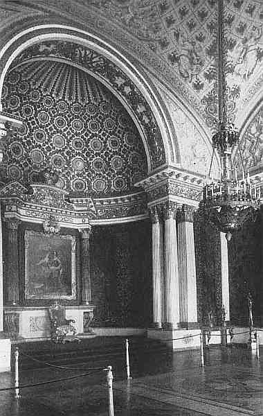 В глубине зала в дореволюционные годы стоял на возвышении царский трон. Теперь здесь установлена громадная мозаичная карта Советского Союза в рамке из белого мрамора с бронзой. Она имеет свою интересную историю.
