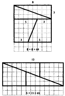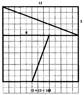 Отметьте, что длины в этом классическом парадоксе — 3, 5, 8 и 13, а это четыре члена ряда Фибоначчи. У этой последовательности есть известное свойство: если возвести в квадрат ее элемент, имеющий номер n, полученная величина будет равна произведению предшествующего и последующего члена ряда ±1 (т. е. членов с номерами n–1 и n+1).