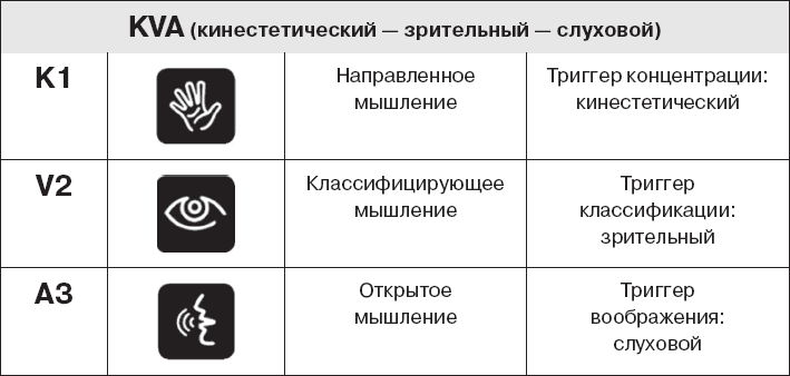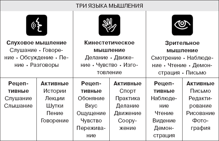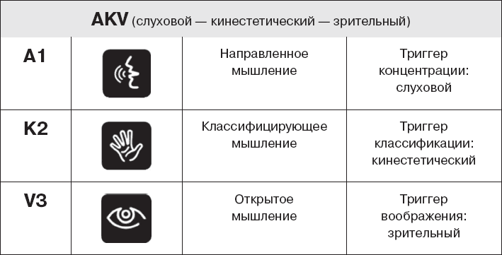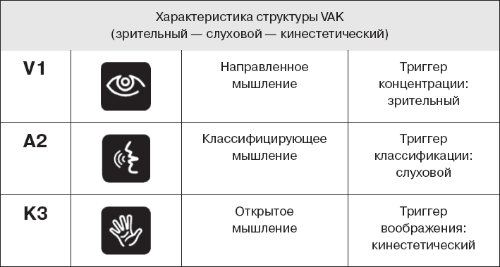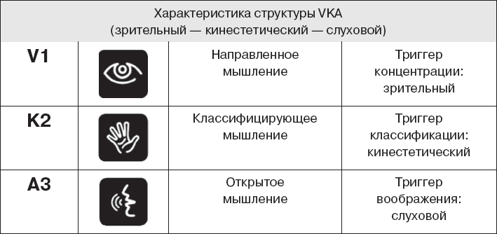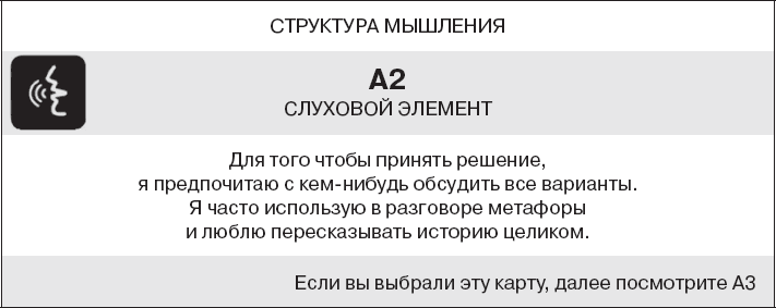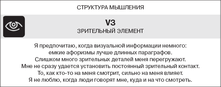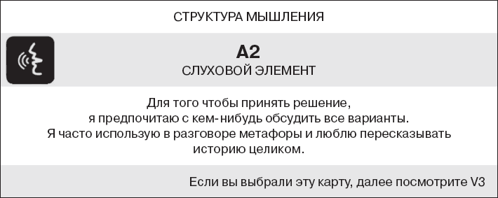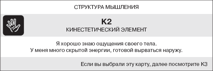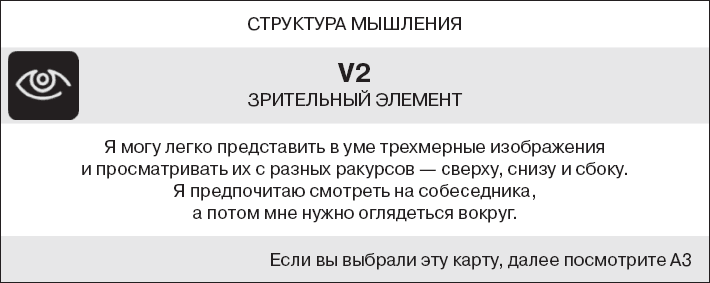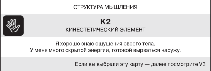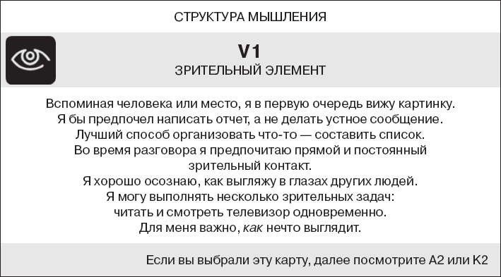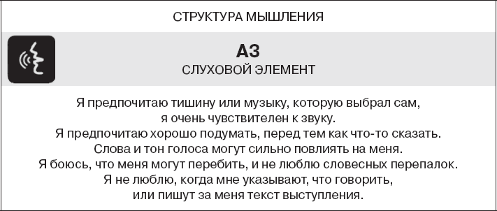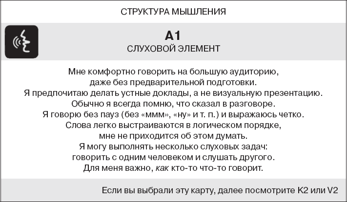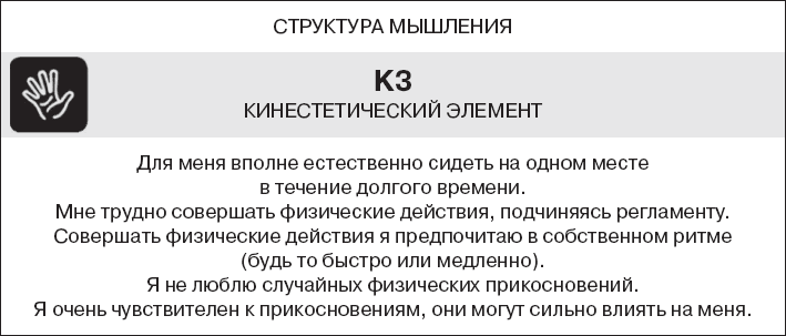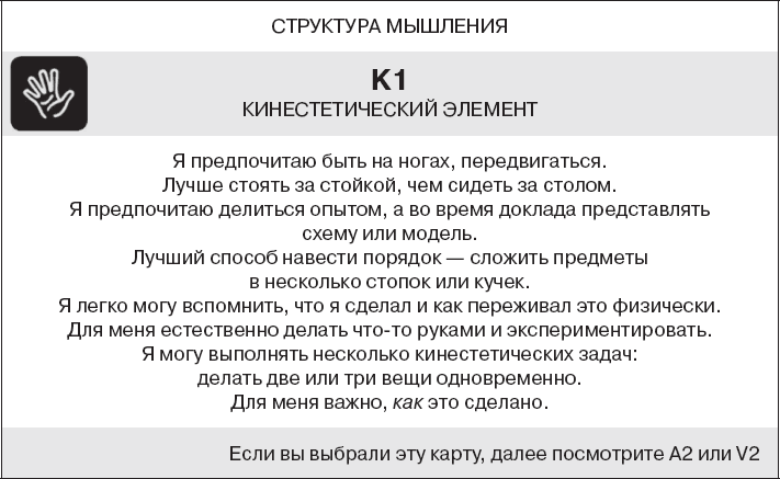 Поставить на вас клеймо, нацепить ярлык – не такова цель нашего теста. Определение типа структуры мышления поможет вам понять, как три элемента – кинестетический (kinesthetic), слуховой (audial) и зрительный (visual) – взаимодействуют между собой в процессе вашего мышления. Это знание поможет вам разобраться в том, как вы мыслите, учитесь и общаетесь. Это не описание вашего характера (многие путают структуры мышления с типологическими особенностями). Однако выявление определенной последовательности, которую ваш ум использует для переключения типа внимания, позволит вам многое о себе узнать.