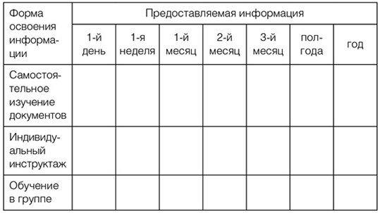 Пример. В одной из производственно-торговых компаний в силу особенностей выпускаемой продукции работа носила сезонный характер. Чтобы освоиться и понять специфику работы с каждым продуктом, у сотрудников отдела продаж уходил один год. И вовсе не потому, что продукты были сложными или продавцы некомпетентными. Дело в том, что полный цикл смены сезонных брендов составлял как раз 12 месяцев. До определенного момента вводный инструктаж в начале испытательного срока включал в себя информацию обо всех брендах и продуктах. Говорить о качественном и оперативном усвоении и использовании этой информации было бы оптимистично. Поэтому со временем был введен оптимальный с точки зрения передачи информации алгоритм знакомства с работой. Этот алгоритм имел варианты наполнения в зависимости от специфики работы подразделения, но выглядел для всех одинаково, вот так: