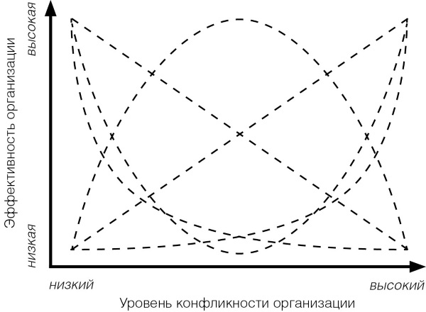 Комментарий. Большинство опрашиваемых уверенно говорили о том, что высокий уровень конфликтности определяет низкую эффективность организации. Однако для многих стало откровением, что низкая конфликтность также имеет негативные последствия. Известная фраза гласит: «Если организм не испытывает стресса, значит, он умер». Так и организация, в которой нет конфликтов, останавливается в развитии. Ключ к высокой эффективности организации – в балансе позитивных и негативных последствий конфликтного напряжения. Какой же будет кривая зависимости? Правильно, перевернутая парабола. Эта кривая дает нам понять: существует оптимальный уровень рабочего напряжения в организации, который позволяет добиться высокой организационной эффективности.