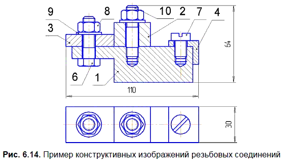 Винтовое соединение (см. рис. 6.12) включает скрепляемые детали, винт и шайбу. В соединениях винтами с потайной головкой и установочными винтами шайбу не ставят.