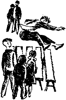 — Володька, поставь четыре скамейки! Слабо перепрыгнуть?