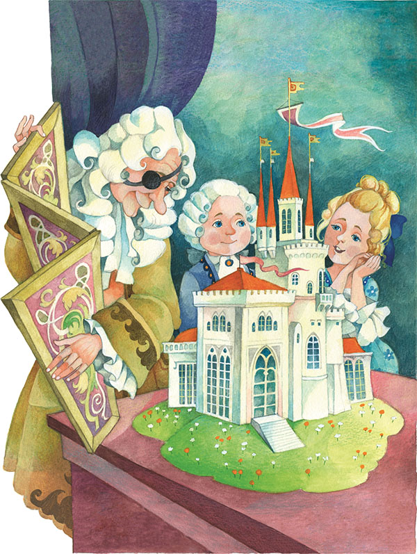 Вдруг раздался звон колокольчиков, двери и окна распахнулись, и стало видно, как по залам замка прогуливаются изящные крошечные кавалеры под руку с дамами в шляпках, украшенных перьями и вуалями. В среднем зале, который от множества крохотных свечей, горевших в серебряных люстрах, казался огненным, в такт звону колокольчиков танцевали дети. Какой-то господин в изумрудном платье часто выглядывал из окна и потом снова исчезал, а сам крёстный Дроссельмайер (только величиной с папин большой палец) время от времени выходил из дверей замка и, постояв, снова уходил внутрь.