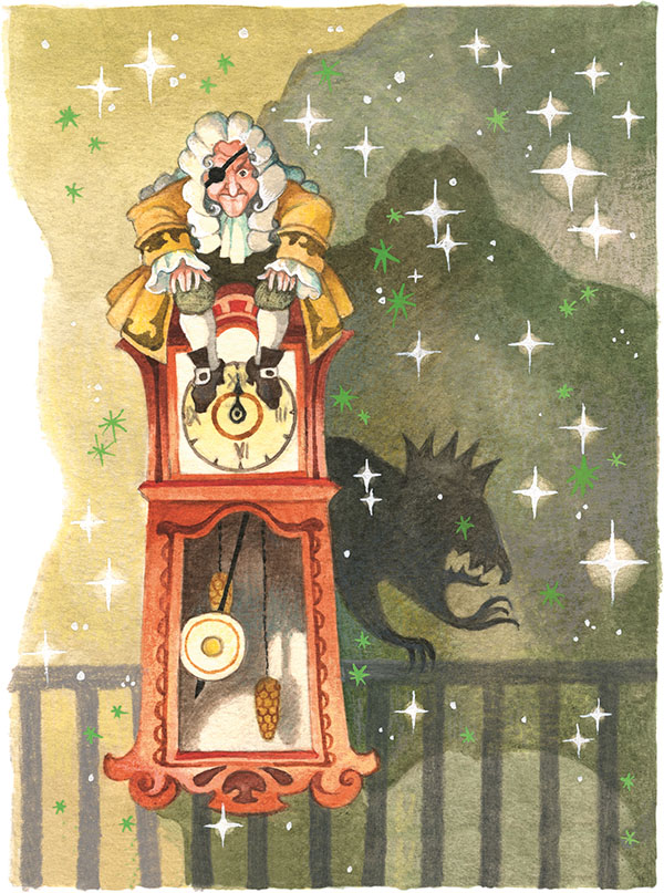 Затем хрипло и глухо раздалось «Бом-бом!» и повторилось двенадцать раз. Мари сделалось так жутко, что от страха она чуть не убежала, как вдруг вместо совы на часах увидала крёстного Дроссельмайера в жёлтом сюртуке, полы которого, словно крылья, свешивались с двух сторон.