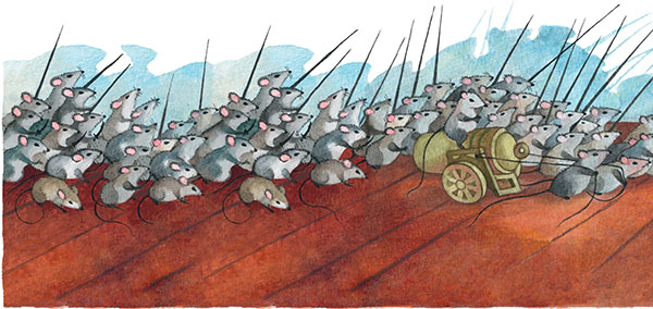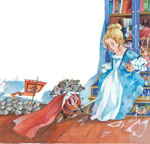 В это время поднялся такой визг и писк, что Мари показалось, будто за стенами топочут тысячи маленьких ног. В тот же миг из щелей пола засверкали тысячи огоньков. Но это были не огоньки – вовсе нет! – это были сверкающие глазки. Мари увидела, как отовсюду выглядывают и вылезают мыши. Скоро по всей комнате беспорядочно забегали, стуча лапками, полчища мышей, а потом и вовсе встали в шеренги, совершенно как солдатики Фрица, когда тот выстраивал их для сражения.