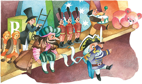 Воодушевлённый этими словами, Щелкунчик решился на опасный прыжок на нижнюю полку, новоиспечённые подданные – за ним. Им-то что не прыгать: и одеты в сукно да шёлк, и внутри у них вата да опилки, – а вот бедный Щелкунчик наверняка сломал бы себе что-нибудь (вы только подумайте: до нижней полки больше полуметра, а туловище-то из хрупкой липы!), если бы не Клара. Кукла быстро вскочила с дивана и поймала нашего героя вместе с обнажённой саблей в свои нежные ручки.