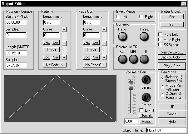 Панорамирование в Samplitude 2496Стереосигнал в этой программе можно панорамировать в Object Editor (Редактор объектов), который доступен из меню Object. Редактор объектов, как и все другие опции в меню Object, работает с выбранным в окне виртуального проекта объектом.