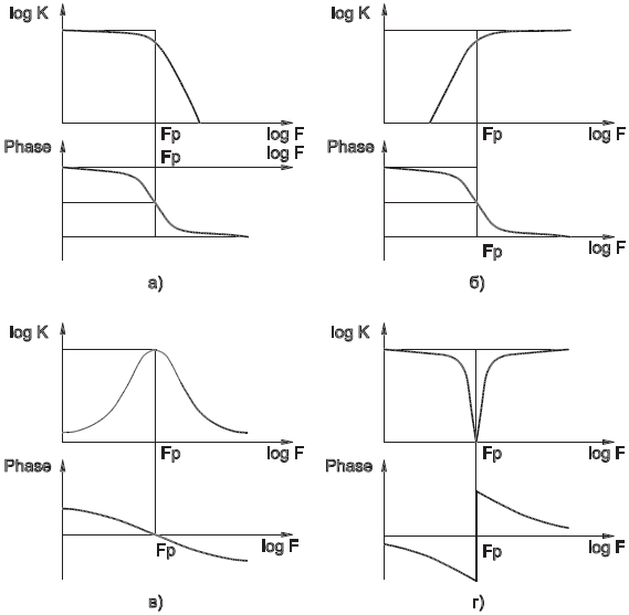 В зависимости от полосы пропускаемых частот фильтры подразделяются на фильтры низких частот (НЧ-фильтры), фильтры высоких частот (ВЧ-фильтры), полосно-пропускающие фильтры (полосовые фильтры) и полосно-задерживающие фильтры (режекторные фильтры). Соответствующие им амплитудно-частотные характеристики (АЧХ) изображены на рис. 1.42.