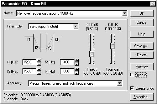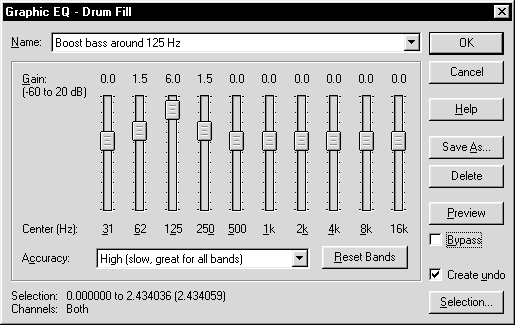 Как и в окне графического эквалайзера, значениями в поле Accuracy (Точность) определяется компромисс между точностью фильтра и быстродействием обработки. Низкая точность не рекомендуется при выполнении очень острой фильтрации, при фильтрации очень низких частот и при использовании высокой частоты дискретизации. Доступны три степени точности: