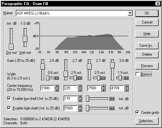 Параграфический эквалайзер в Sound ForgeParagraphic EQ (Параграфический эквалайзер) – это параметрический эквалайзер с графическим дисплеем. Он состоит из четырех полностью параметрических (то есть настраиваемых, с регулируемыми параметрами) пиковых фильтров, а также одного высокочастотного и одного низкочастотного фильтров. Такой эквалайзер очень нагляден и удобен при работе со звуком.