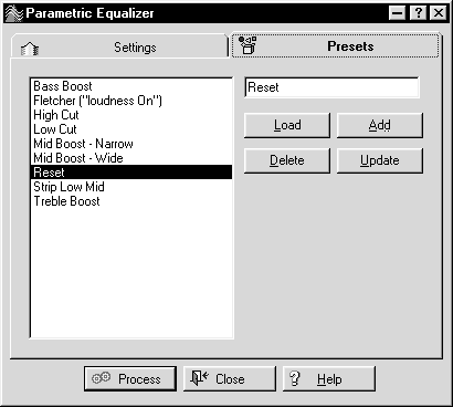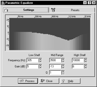 Параметрический эквалайзер в WaveLabПо команде EQ из меню Process открывается окно Parametric Equalizer (Параметрический эквалайзер). Вкладка Settings (Настройки) этого окна показана на рис. 1.50.