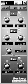 Этот стандартный параметрический эквалайзер обладает свойствами высококачественного микшерного пульта. Каждая полоса частот – High (Высокие), Mid (Средние) и Low (Низкие) – может быть отключена с помощью соответствующих кнопок с надписями High, Mid и Low или маленьких кнопок-индикаторов, расположенных рядом с ними, так что не требуется изменять регулировки ручек dB, чтобы сравнить сигнал с эквалайзером и без него.