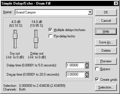 Эффект Delay/Echo (Задержка/Эхо) добавляет задержанную по времени копию звукового сигнала к файлу. Одиночная или многократные задержки могут добавляться как до звукового сигнала, так и после него.