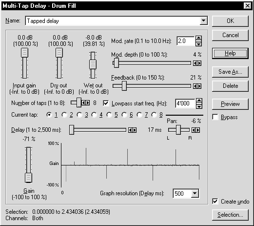 Опция Delay time (Время задержки) определяет промежуток времени между оригинальным звуком и копией с задержкой. Кроме того, если установлен флажок Multiple delays/echoes, эхо отображается на экране с интервалами, определенными в поле Delay time.