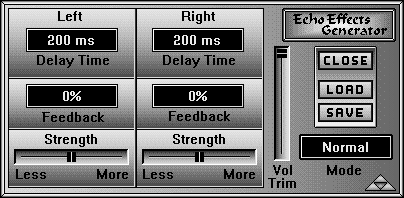 С помощью кнопки Load загружаются предварительно сохраненные файлы, содержащие все корректируемые параметры настроек эффекта. Нажатием этой кнопки открывается диалоговое окно выбора файла. Выберите имя файла для загрузки, и будут установлены все параметры настройки, сохраненные в нем. Файлы настроек эффекта Echo/Delay имеют расширение EKO.Аналогично с помощью кнопки Save (Сохранить) эти файлы создаются и записываются на диск.