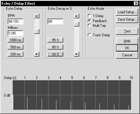 Программа позволяет применять эффект эха к выделенному фрагменту волнового проекта. Графический дисплей в окне представляет амплитуды звуковых отражений сигнала (эхо) через промежутки времени, определенные текущими параметрами настройки. Каждая вертикальная линия – это эхо первоначального звука. Длина каждой линии соответствует амплитуде эха (как процент от амплитуды первоначального звука), в то время как расстояние по горизонтали от левого края до линии эха представляет собой задержку времени.