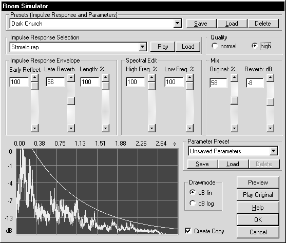 • чтобы использовать Room Simulator в реальном времени, выведите копию задержанного сигнала на другой канал виртуального проекта. Тогда все настройки можно будет изменять с помощью стандартных инструментальных средств, а в окне микшера канал с реверберацией смешивать с каналом основного источника звука. Для этого скопируйте основной канал в другой (канал эффекта) и откройте диалоговое окно Room Simulator. В нем задайте параметру Mix значение 0 и запустите обработку. Не забудьте при этом пометить опцию Create Copy (Создавать копию), иначе сигнал реверберации будет добавлен в исходный канал.