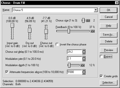 Хорус в Sound ForgeБлагодаря усовершенствованному алгоритму частотной модуляции с помощью этой функции можно достичь разнообразных эффектов, в том числе и не напоминающих хорус. При большой глубине модуляции будет получен эффект вибрато. При незначительной величине задержки возникнет эффект флэнжера.