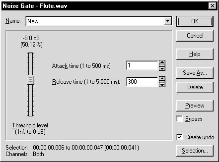 Другими двумя параметрами в окне шумоподавителя – Attack time (Время срабатывания) и Release time (Время отпускания) – задаются соответствующие динамические характеристики устройства. Первым определяется время, в течение которого появляется после паузы звук, имеющий амплитуду выше порогового уровня; вторым – время затухания громкого звука. Если значение Attack time слишком мало, начало речевой или музыкальной фразы, вероятно, будет срезано. Соответственно, если мало значение Release time, может быть обрезан конец тихой фразы. Требуется поэкспериментировать с этими параметрами, чтобы удалить как можно больше шумов и в то же время не исказить полезный звуковой сигнал.
