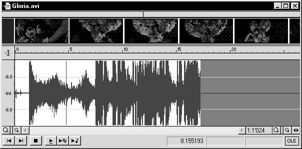 При открытии AVI-файла верхняя часть окна отводится под видеополосу. Видеополоса представляет собой последовательность кадров (как на киноленте). Число видимых кадров зависит от ширины полосы и масштаба. Чем шире полоса и больше масштаб, тем крупнее изображение и тем меньше кадров отображается на экране. Левый край отображаемых кадров синхронизирован со звуковой волной. Кадры на экране могут быть пронумерованы: для этого щелкните правой кнопкой мыши по видеополосе и выберите из контекстного меню опцию Number Frames (Номера кадров). Чтобы изменить размеры видеополосы, перемещайте ее нижний край вверх или вниз.