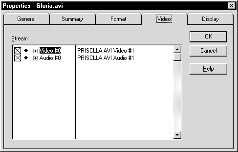 Чтобы присоединить видео к уже открытому звуковому файлу, выберите пункт Properties из меню File и перейдите на вкладку Video. Нажмите кнопку Attach. В открывшемся диалоговом окне Attach Video вы можете отметить AVI-файл, который нужно присоединить к звуку. После выбора AVI-файла с видеопотоком нажмите кнопку OK. На вкладке Video окна Properties теперь отображены аудио– и видеопотоки, как показано на рис. 1.96. AVI-файл может содержать множественные потоки, но в большинстве случаев вам нужен один аудиопоток и один видеопоток.