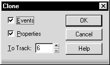 При копировании трека с помощью команды Clone (Создать аналог) из меню Track вы можете выбрать и скопировать или только реквизиты трека, или только события в треке, или и то и другое. При выполнении команды открывается окно Clone (Аналог), изображенное на рис. 4.3. Можно пометить опции Events (События) и Properties (Свойства), а можно также выбрать трек, на который будет копироваться информация – опция To Track (На трек…). По умолчанию Cakewalk копирует данные трека на очередной свободный трек.