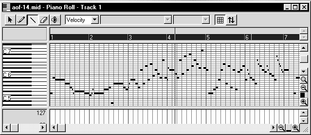 Клавишная сетка. Информация каждого MIDI-трека представлена графически, причем по вертикальной оси расположены клавиши фортепиано, соответствующие высоте звука, а по горизонтальной откладывается время.
