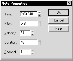 Ноты можно добавлять с помощью инструмента Draw (Рисовать), нажав соответствующую кнопку инструментальной панели. Программа запоминает громкость, длительность и канал последней перемещенной, отредактированной или удаленной ноты и автоматически использует эти характеристики для новых нот. С помощью мыши можно свободно редактировать время начала звучания каждой ноты, ее высоту или длительность. Можно также щелкнуть правой кнопкой мыши по любой ноте, и в открывшемся окне Note Properties (Характеристики ноты) отредактировать параметры Time (Время начала), Pitch (Высота), Velocity (Скорость нажатия), Duration (Длительность) и Channel (Канал), как изображено на рис. 4.5.