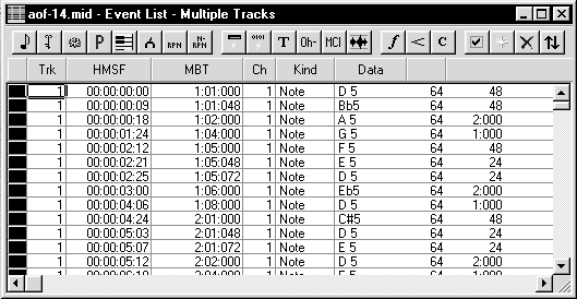 Чтобы открыть список MIDI-событий, надо выделить один или несколько треков в окне Track (Трек) и выполнить команду Event List (Список событий) из меню View (Просмотр) либо нажать на правую кнопку мыши (указатель при этом должен находиться на треке). Из появившегося контекстного меню следует выбрать одноименную команду либо нажать кнопку Event List view (Просмотр списка событий) на панели инструментов. Откроется окно Event List, изображенное на рис. 4.9.