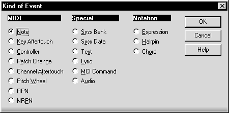 Остальные параметры меняются в зависимости от типа события. В окне Event List тип события указан в колонке Kind (Тип). Для его смены нужно дважды щелкнуть мышью в ячейке на пересечении строки события и колонки Kind, при этом откроется окно Kind of Event (Тип события), вид которого показан на рис. 4.12 и в котором надо пометить нужный тип.