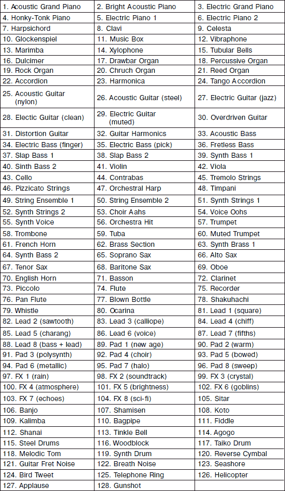 И наконец, самое главное, ради чего, собственно, и создавался стандарт General MIDI – 128 звуков мелодических инструментов и 47 звуков ударных инструментов должны быть организованы в определенном порядке, отраженном в табл. 4.9 и 4.10.