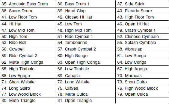 • звуки ударных должны соответствовать определенным MIDI-нотам.