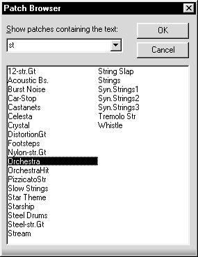 В раскрывающихся списках выберите требуемые параметры Bank и Patch, а также Bank Select Method (Метод выбора банка). Различные MIDI-инструменты используют разные типы команд для смены банков. Cakewalk поддерживает четыре метода смены банков. Для поиска нужного инструмента можно воспользоваться кнопкой, расположенной справа от полей Bank и Patch. При ее нажатии открывается окно Patch Browser (Просмотр инструментов), изображенное на рис. 4.14, в котором можно найти нужные звуки по их названиям. Для этого в поле Show patches containing the text (Показывать инструменты, содержащие текст) введите символы, входящие в название инструмента, и появится соответствующий список. Если оставить это поле незаполненным, на экран будет выведен полный список доступных инструментов.