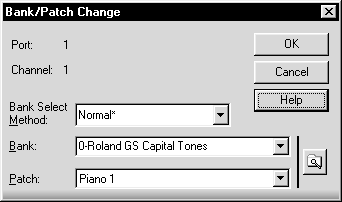 Чтобы сменить инструмент в треке непосредственно при воспроизведении, надо воспользоваться командой Bank/Patch Change (Смена банка/ инструмента) из меню Insert (Вставка) и тем самым открыть окно Bank/ Patch Change, показанное на рис. 4.15.